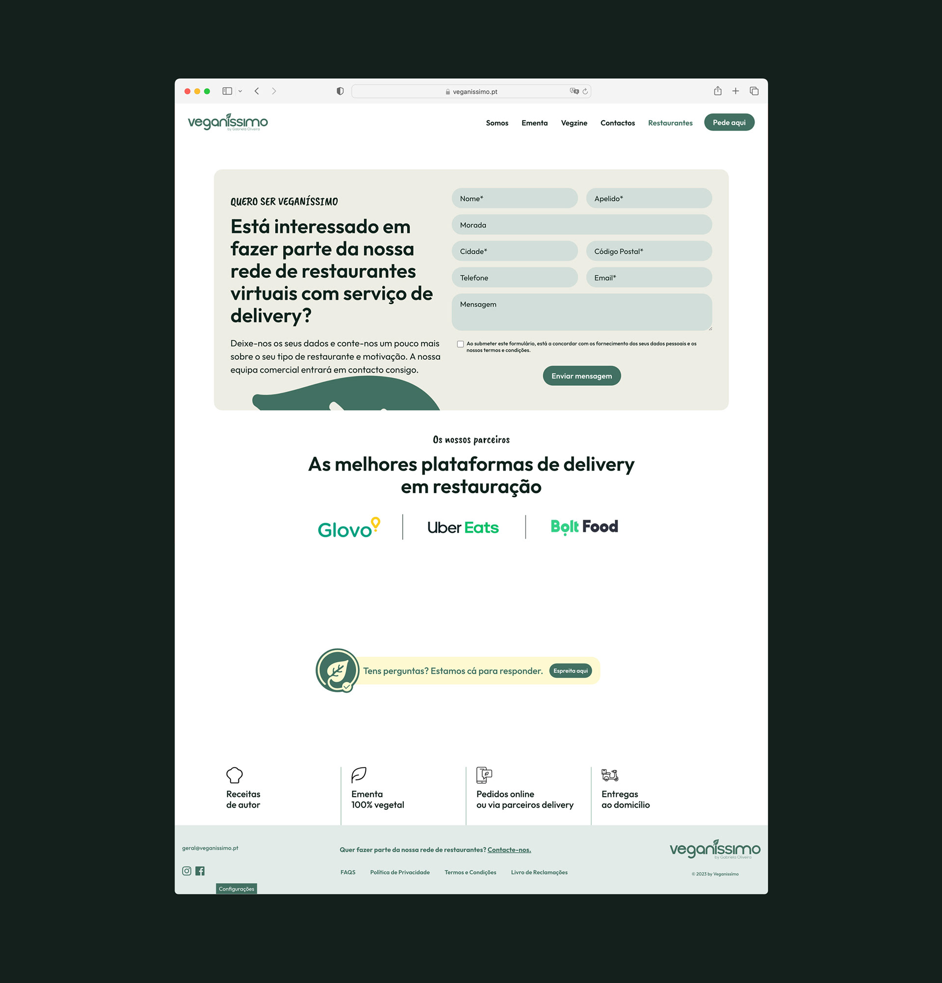 It is a responsive website that allows the user to navigate through different pages to discover everything about the brand, the available menu, the Vegzine blog, contacts, meal requests, and a registration form for restaurants that are members of the Veganissimo network.